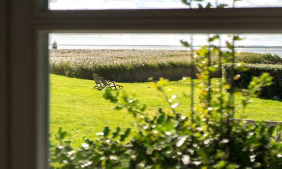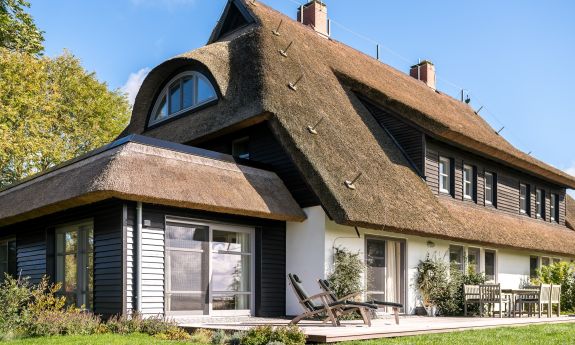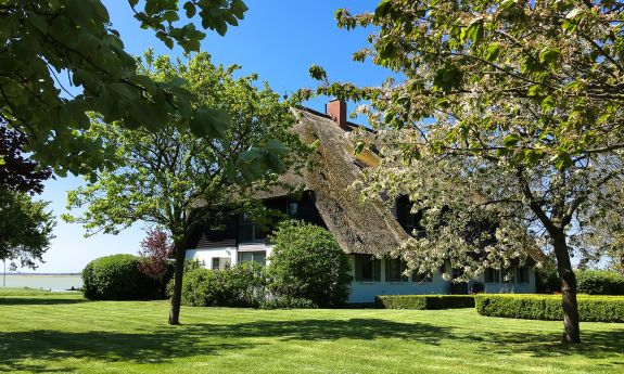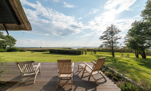 Ein besonderes Highlight ist die großzügige Holzterrasse, von der Sie einen weiten Blick über das 8.000 Quadratmeter große Wassergrundstück und auf vorbeiziehende Zeesboote genießen. Diese Aussicht und Lage sind absolut einmalig auf dem Fischland und versprechen Erholung und ein ganz besonderes Urlaubs-Feeling. In dem Nebengebäude steht Ihnen eine kleine Wellnessoase mit Sauna*, Dusche mit flacher Wanne, Fußbad, WC, Ruheraum und Fitnessgeräte zur Verfügung. Zudem bietet Ihnen das Naturgrundstück eine Liegewiese, einen Grillplatz und verschiedene Sitzgelegenheiten mit einem atemberaubenden Blick auf das Wasser. Abgerundet wird dieses Traumensemble mit einem eigenen kleinen Hafen samt Ruderboot, mit dem Sie gern über den Bodden rudern dürfen. Ein PKW-Stellplatz sowie Abstellmöglichkeiten für Fahrräder und Surfbretter stehen zur Verfügung. Ab Frühjahr 2022 steht unseren Gästen auch eine Ladestation für Elektrofahrzeuge zur Verfügung.