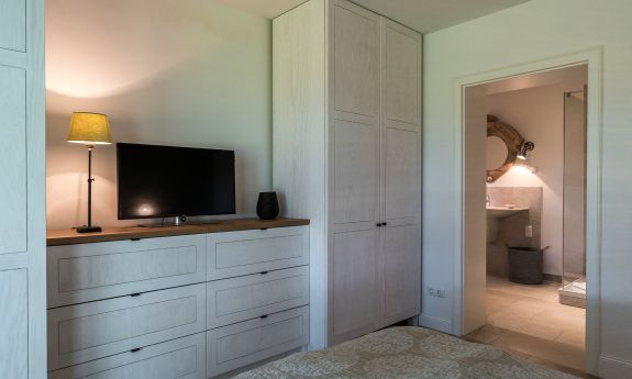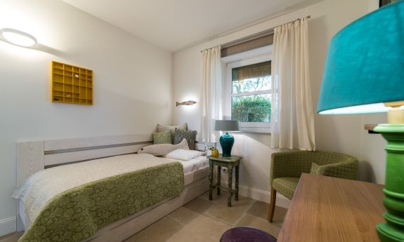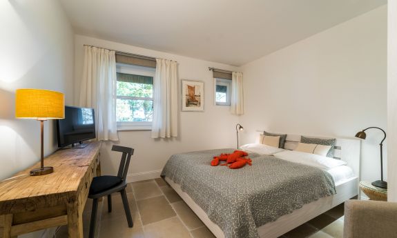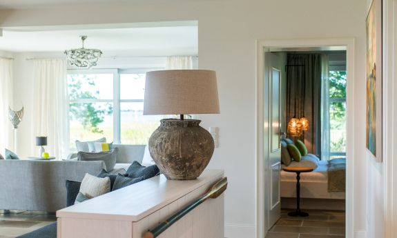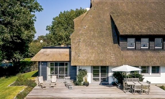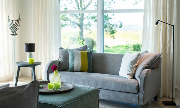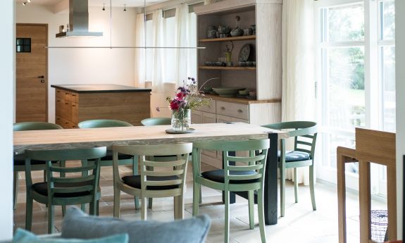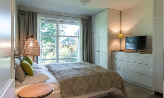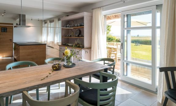Die Ferienwohnung begeistert durch ihren lichtdurchfluteten Wohnraum mit einer gemütlichen Sitzecke und Schaukelstuhl sowie einem traumhaften Essbereich an bodentiefen Fenstern. Eine liebevolle und zeitgleich sehr hochwertige Ausstattung schaffen eine Atmosphäre zum Wohlfühlen. Zum exklusiven Wohnraum gehören auch ein offener Kamin und ein wundervoller Blick in den Garten. Die moderne offene Küche ist mit einer Kochinsel und edlem Keramikgeschirr ebenfalls sehr komfortabel ausgestattet. Die harmonischen Farben und Materialien führen sich auch in der Einrichtung der drei Schlafzimmer fort, die mit exquisiten Doppelbetten, einem ausziehbaren Einzelbett (ein Schlafzimmer) und ausgesuchten Kunstgegenständen möbliert sind. Hier finden Sie den erholsamen Schlaf, den Sie sich im Urlaub wünschen. Zwei moderne Bäder mit Dusche/WC vervollständigen die komfortable und 140 Quadratmeter große Ferienwohnung.