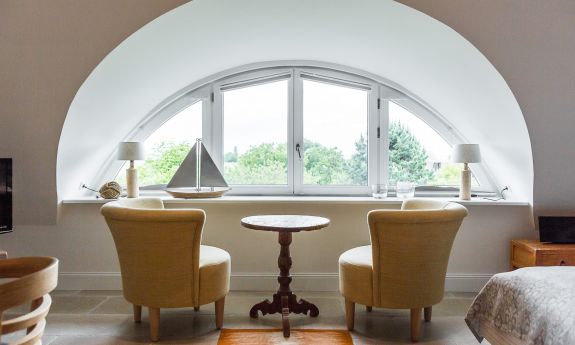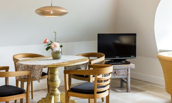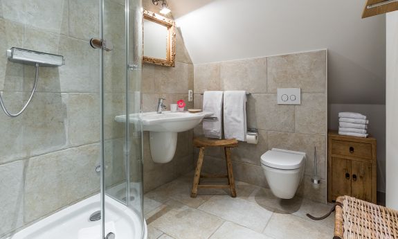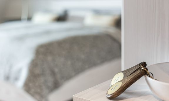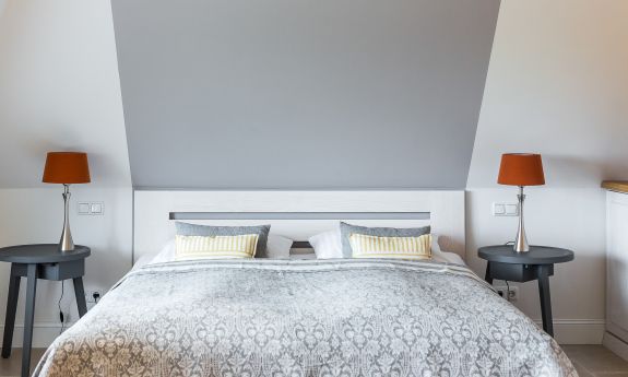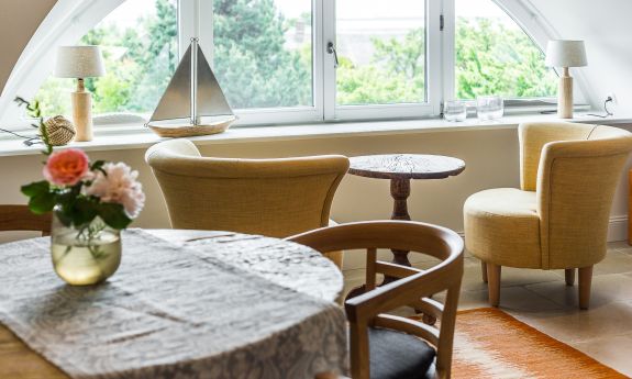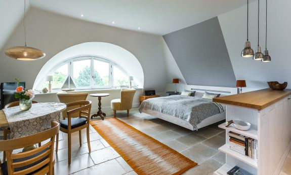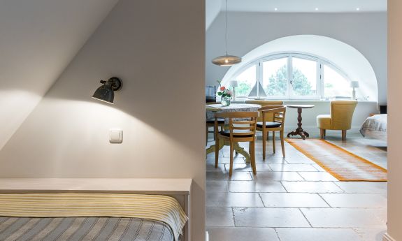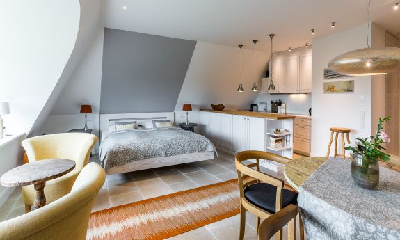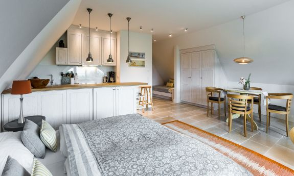 Die Studiowohnung im Dachgeschoss begeistert durch ihre stilvolle Einrichtung und komfortable Aufteilung. Es erwartet Sie ein eleganter Wohn- und Schlafraum mit einem gemütlichen Sitzplatz am Gaubenfenster mit traumhaftem Boddenblick, ein Esstisch, ein exquisites Doppelbett und eine moderne Küchenzeile. Sanfte Naturtöne und -materialien sowie ausgesuchte Deko-Elemente machen den Wohlfühl- und Wohnkomfort perfekt. Eine separate Schlafnische mit einem Einzelbett und ein elegantes Bad mit Dusche/WC vervollständigen die komfortable und 50 Quadratmeter große Ferienwohnung.