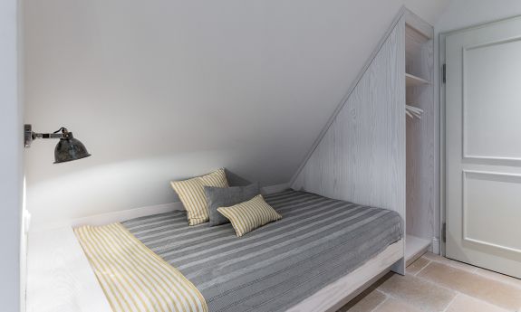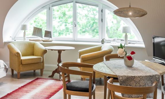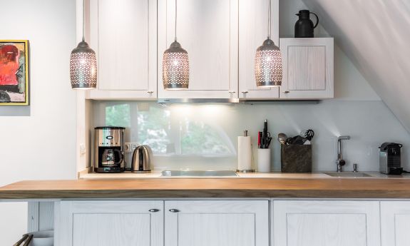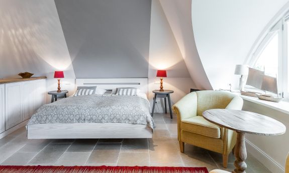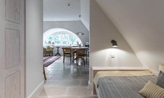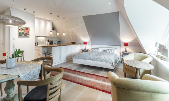 Die Studiowohnung im Dachgeschoss begeistert durch ihre stilvolle Einrichtung und komfortable Aufteilung. Es erwartet Sie ein eleganter Wohn- und Schlafraum mit einem gemütlichen Sitzplatz am Gaubenfenster mit traumhaftem Boddenblick, ein Esstisch, ein exquisites Doppelbett und eine moderne Küchenzeile. Sanfte Naturtöne und -materialien sowie ausgesuchte Deko-Elemente machen den Wohlfühl- und Wohnkomfort perfekt. Eine separate Schlafnische mit einem Einzelbett und ein elegantes Bad mit Dusche/WC vervollständigen die komfortable und 50 Quadratmeter große Ferienwohnung.